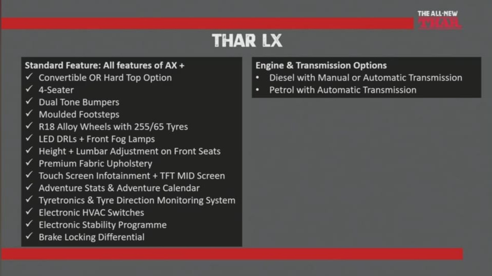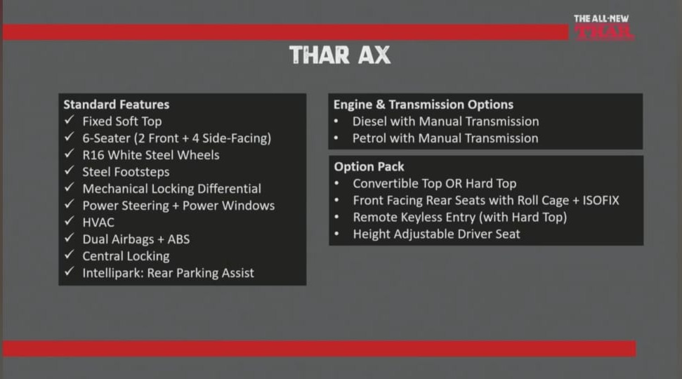 Mahindra provides the Thar with LX and AX series. The AX gets six-seats, steel wheel rims (ideal for offroad), park assists, and is available with only manual transmission because its the adventure variant. It is also made available with the optional package to choose between convertible top and hardtop and other goodies.