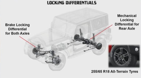 The new Thar gets independent front suspension and multilink rear suspension adding to its on-road comfort and off-road capability. The combination of mechanical and brake locking differentials available with all-terrain tyres ensures the vehicle glides over obstacles without hassle over any terrain.